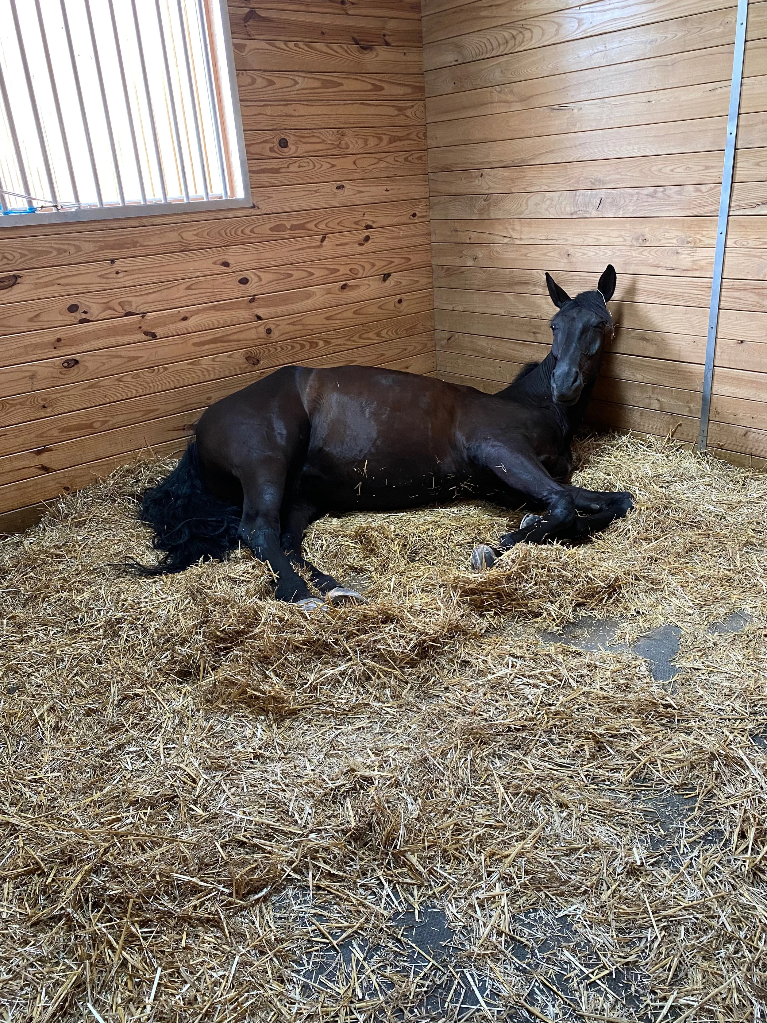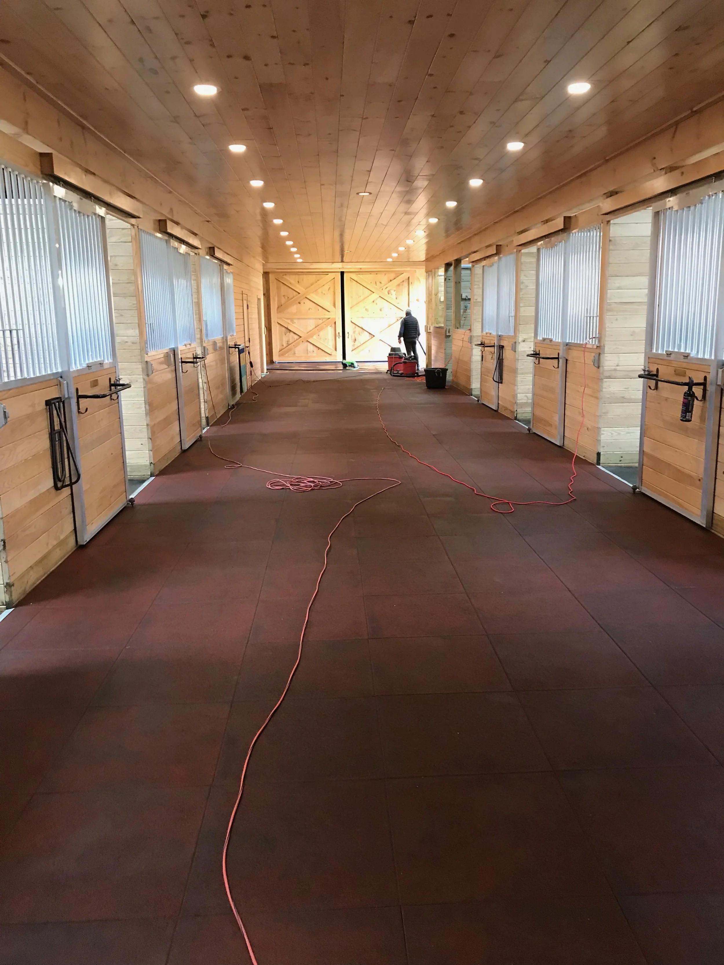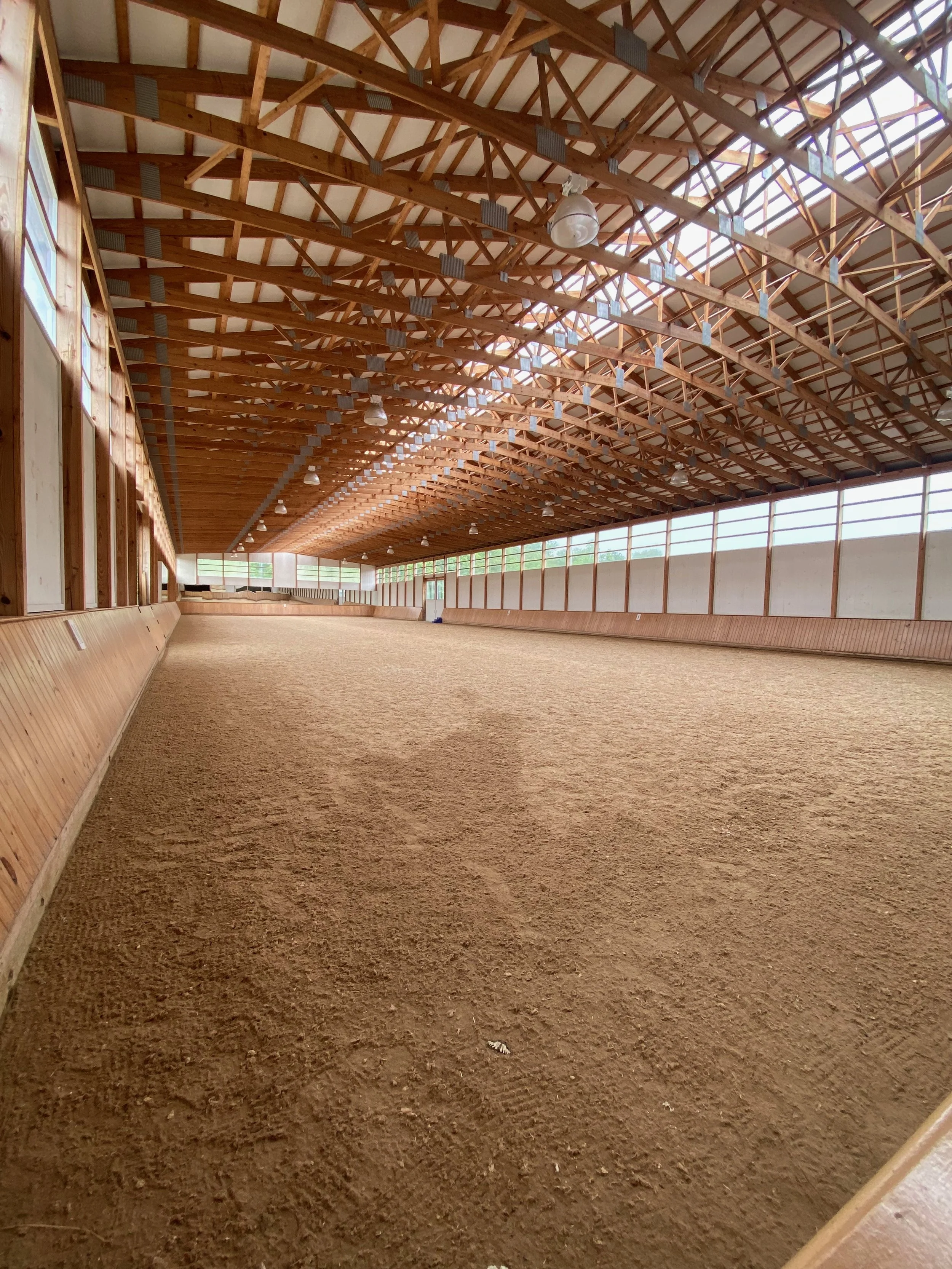 Stalls are 12 x 12 with solid wood walls and rubber mat flooring. Each stall features a large window and sliding doors which are wood below and railing above